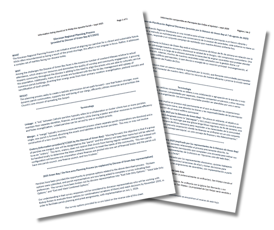 La Diócesis de Green Bay está llevando a cabo un proceso de planificación parroquial para el área de Green Bay/ De Pere. Esto incluye información que potencialmente pudiera afectar a nuestra parroquia. Hemos resumido este documento en dos páginas para su conveniencia. Dele clic al botón de abajo para leer en el idioma de su preferencia.