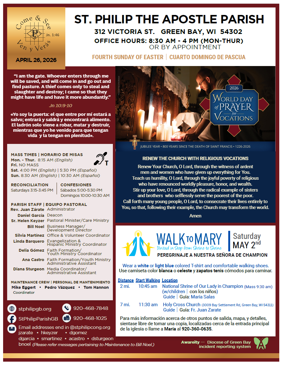 Stay connected to all that's happening here. Download the most recent church bulletins containing, photos, stories, news and event information.